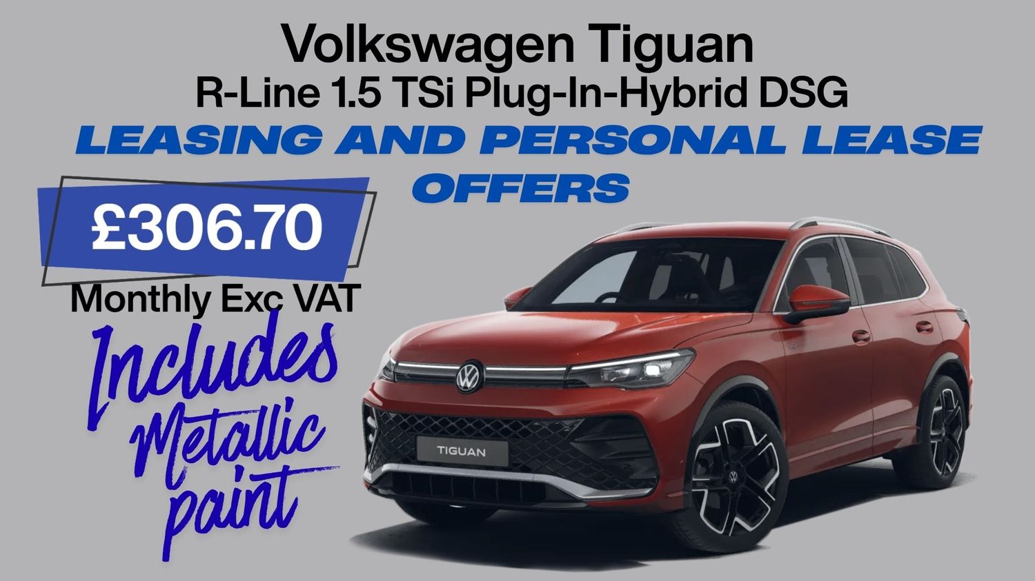 AVC offers an array of exhilarating leasing options for the VW Tiguan R-Line 1.5 TSI eHybrid DSG, featuring fantastic deals in both metallic and standard paint finishes. You can choose from several options, including a budget-friendly initial payment for just one month, a higher initial payment to reduce monthly installments, or a personalized quote designed to meet your specific needs alongside this promotional offer.