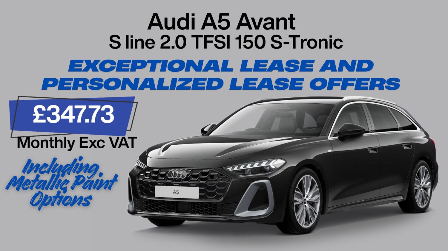 AVC offers outstanding leasing and personal leasing options for a select range of Pre Reg A5 AVANT S line 2.0 TFSI 150 S Tronic. This model is a sleek estate car that features a sporty exterior design, along with a versatile load space and a luxurious feel. The Avant's 476-liter boot, which can be expanded to 1,424 liters with the rear seats folded, provides ample room for luggage and everyday essentials. The power-operated tailgate and split-folding rear seats enhance its practicality. The S Line sport styling includes 19-inch alloy wheels, distinctive bumpers, side sills, a rear diffuser, and S Line badging.