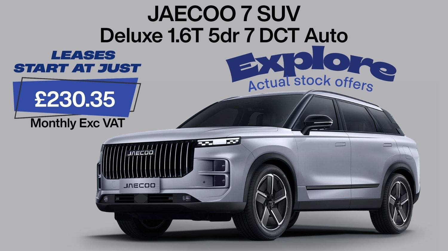 Explore exciting offers on the JAECOO 7 Deluxe, featuring outstanding leasing prices. This model is an affordable luxury SUV, equipped with a powerful 1.6T GDi high-torque engine. The exterior boasts a sleek, striking design with 19-inch alloy wheels. Inside, enjoy heated front seats upholstered in luxurious synthetic black leather, accented with detailed stitching. The vehicle offers top-tier entertainment with a 13-inch central touchscreen, wireless Apple CarPlay and Android Auto, a comprehensive suite of accident-avoidance safety systems, and much more.