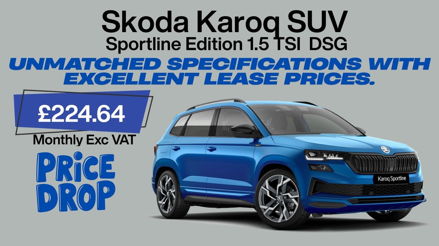 Introducing the ŠKODA Karoq Sportline Edition, a blend of performance and style featuring a 1.5 TSI engine with DSG transmission, offering impressive fuel economy of up to 45 miles per gallon. The Karaq Sportline stands out from every angle with its sports design elements, which include a black grille, roof rails, a set of 19-inch anthracite wheels, and a panoramic sunroof. The advanced lighting package features full-L E D matrix headlights, while the interior boasts ambient lighting, a heated steering wheel, and sport seats in black thermoflux cloth with silver stitching, with built-in headrests. To the rear, there is a spacious fold-down split seat system. There is a Columbus navigation pack with a 9.2-inch screen and top infotainment. Enjoy added features, including a virtual boot option and adaptive cruise control. Special leasing offers include free metallic paint options.
